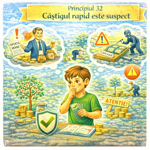 Acest principiu protejează copilul de iluzii financiare și riscuri inutile. Un copil care învață să fie prudent față de câștigurile rapide va construi prosperitate pe baze solide, nu pe promisiuni fragile.